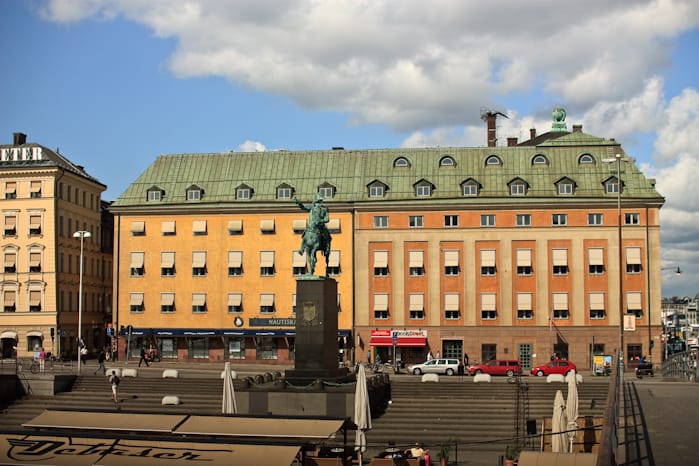 Hans Hedberg har sitt kontor på Slussplan med utsikt över statyn av Karl XIV Johan. Detta är Räntmästarhuset som har ritats av Nicodemus Tessin den äldre och bör vara där kontoret ligger. I boken nämns bl.a att det finns en liten terass här och om den är uppdiktad av Jan eller om den finns på riktigt kan man fundera över. Karl XIV red förövrigt in mot Gamla Stan från början men har vänts så han rider ut efter ombyggnaden av Slussen, kanske vänds han igen efter den kommande ombyggnaden.