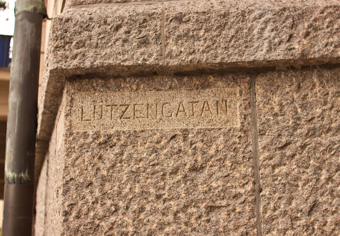 Här någonstans på Lützengatan bland grönskande träd bor Johan Homans särbo/delsbo Francine Silfverstierna i en takvåning om jag inte minns fel. Men det finns en anledning till att vi befinner oss här. I Palatsmordet så bor en av de medverkande också vid Karlaplan fast i andra riktningen ner mot Narvavägen.