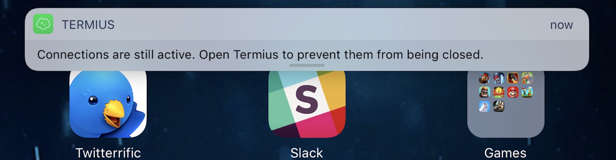 Jag använder SSH en hel del och en sådan anslutning till en server måste hållas aktiv annars loggas man ut och i värsta fall tappas osparat data. Detta gör det nästan omöjligt att arbeta mot servrar ifrån iPad. Hela tiden måste man komma ihåg att byta till SSH-appen för att hålla anslutningen vid liv. Efter tre minuter så klipps den och det är bara att börja om från början igen. Som tur är finns det program som Screen i Linux som ser till att man kan fortsätta jobba där man var men det tar 5-10 sekunder i uppkopplingstid.