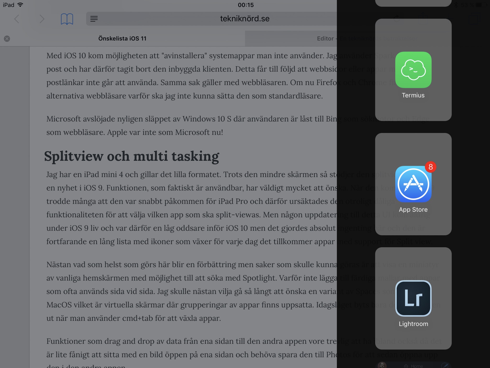 Jag har en iPad mini 4 och gillar det lilla formatet. Trots den mindre skärmen så stödjer den splitview som var en nyhet i iOS 9. Funktionen, som faktiskt är användbar, har väldigt mycket att önska. När den kom med iOS 9 trodde många att den var snabbt påkommen för iPad Pro och därför ursäktades den otroligt dåliga appväljaren. Någon uppdatering till detta UI kom aldrig under iOS 9 liv och var därför en lågoddsare inför iOS 10 men det hände absolut ingenting och den är fortfarande en lång lista med ikoner som växer för varje dag det tillkommer appar med support för Split view.