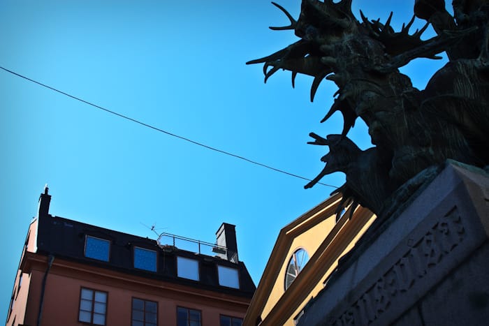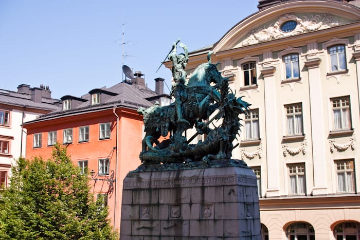 På Köpmantorget står den berömda avbildningen av Sankt Göran och draken (orginalet finns i Storkyrkan). Denna staty i brons omnämns flera gånger i böckerna om antikhandlaren Homan. Vi får ofta höra att han ser denna staty ifrån sin balkong i takvåningen på Köpmantorget 10 vilket borde betyda att vi kan se Homans balkong ifrån statyn. Låt oss därför blicka upp mot taket på det rödorangea huset mittemot statyn (eller vad kallas färgen egentligen?).