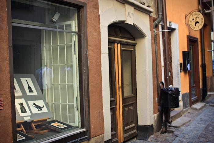 Köpmangatan 11 hittar jag. Någonstans bakom denna port bor Ellen Andersson, Ellen i Elvan, Homans allt-i-allo som städar, lagar portionsmat till honom och kardemummakaka till Cléo. Är det föressten Cléos siluett vi ser avbildad i skyltfönstret?
