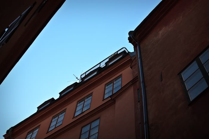 Uppe på taket ser vi ett svart balkongräcke med några blomlådor. Detta måste alltså vara Homans balkong där han ofta sitter och dricker dry martini och tittar ut över taken bort mot Djurgården och Gröna lund. Tittar man sedan på bokomslaget till "Mord i Gamla stan" så ser man Jan sitta på en stol uppe vid denna balkong så därför ingen tvekan, där uppe bor Johan Kristian Homan.