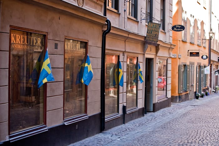Och här är den i all sin glans. Stockholms äldsta gata, Köpmangatan i Gamla stan. Längst bort ser vi börshuset vid Stortorget där Svenska akademin håller hus. Här ligger även en Tintin-butik som är väl värt ett besök och någonstans efter den här gatan ska alltså Homan antik ligga.